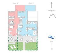 Carlo A hat einen schönen kleinen Garten zur Seeseite mit teilüberdachter Terrasse.
