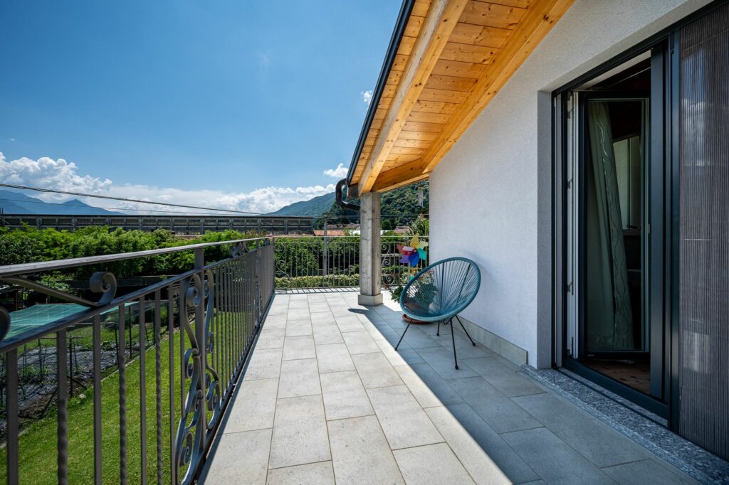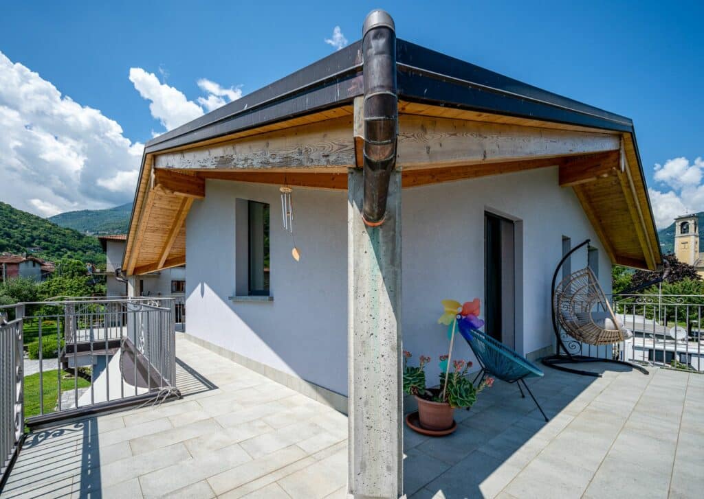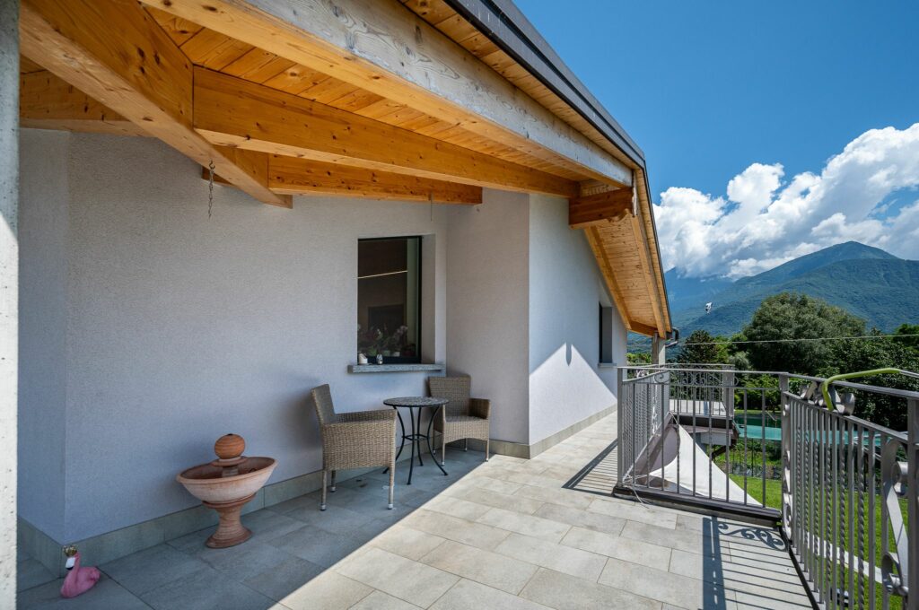 Das Haus ist auf drei Seiten von einem Balkon mit Seeblick umgeben, der auf die Terrasse führt, die als Solarium mit Liegestühlen und Sonnenliegen dient.