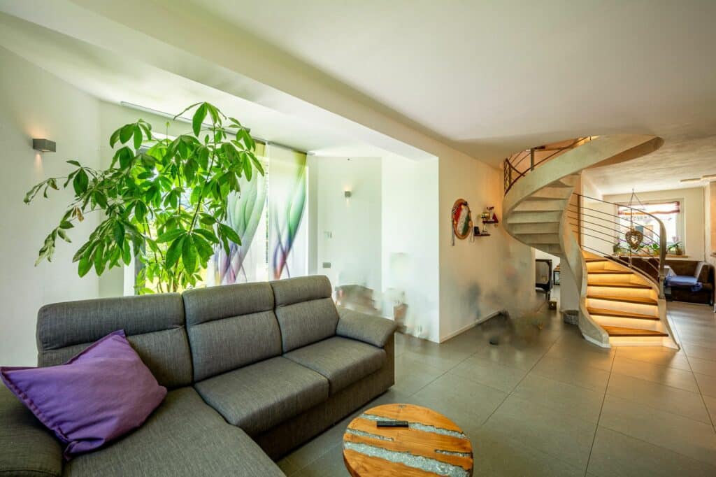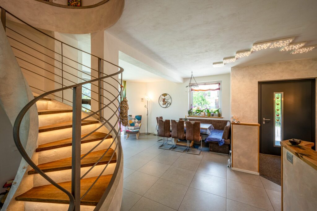 In der Mitte erhebt sich die Wendeltreppe, die in das Obergeschoss führt.