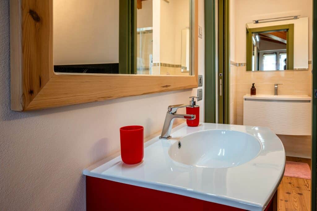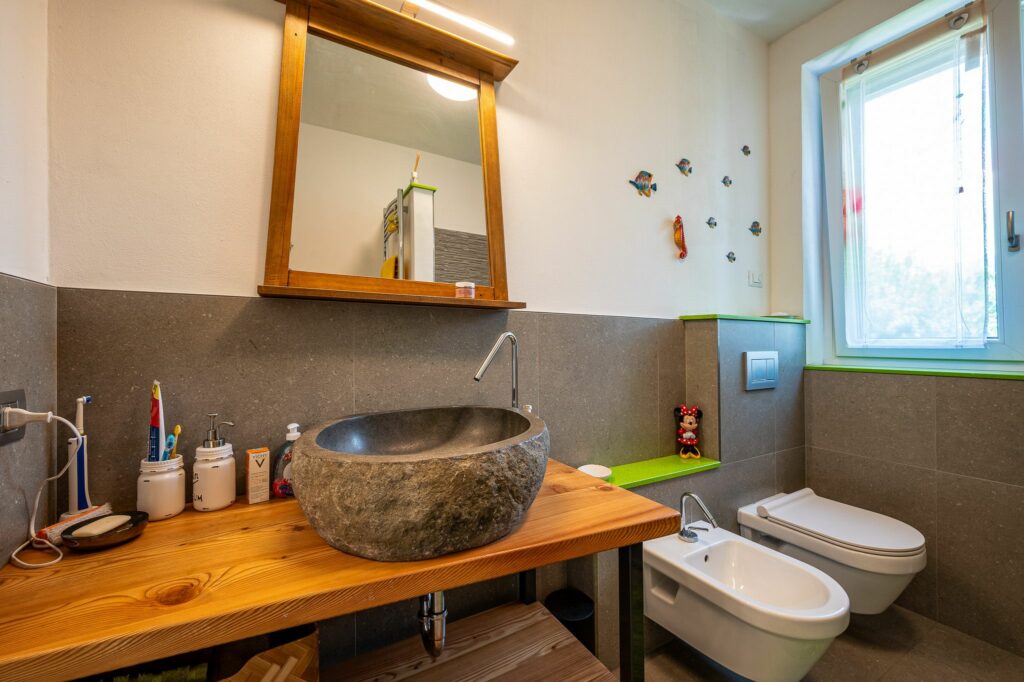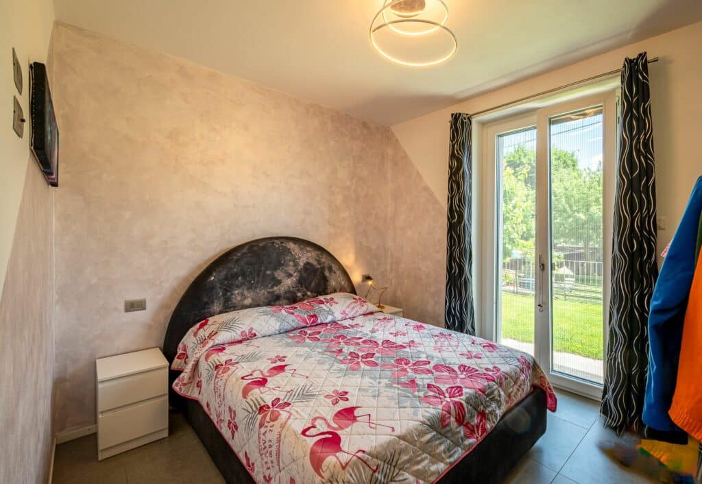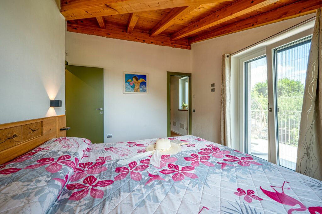 Auf dieser Etage befindet sich das Badezimmer mit Hydromassage-Dusche und das Schlafzimmer mit direktem Zugang zum Garten.