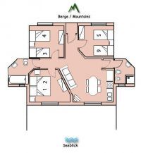 Das Doppelzimmer hat ebenfalls Seeblick und Zugang zum Panorama-Balkon mit Esstisch und Liegestühlen. Es gibt zwei weitere Zweibettzimmer (Betten zusammenstellbar) zur Berg- und Gartenseite. Die zwei modernen Bäder sind einmal mit Dusche und einmal mit Badewanne ausgestattet, beide haben Waschtisch und WC/Bidet.