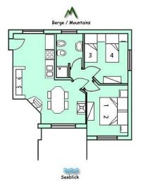 Es gibt ein Doppelzimmer zur Seeseite mit traumhaften Panoramablick und ein Zweibettzimmer (Betten zusammenstellbar) zur Bergseite, sowie ein Bad mit Waschtisch, Badewanne und WC/Bidet.