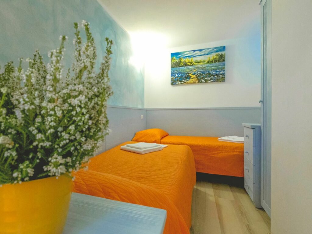 Der Flur führt ins Doppelzimmer mit Seeblick, übergehend in das kleine Zweibettzimmer mit kl. Fenster zur Bergseite. Das Fenster-Bad ist mit Dusche, Waschtisch, WC und Bidet. Der Pool befindet sich seitlich oberhalb mit Blickschutz mit angenehmen Wasserfallgeräuschen.