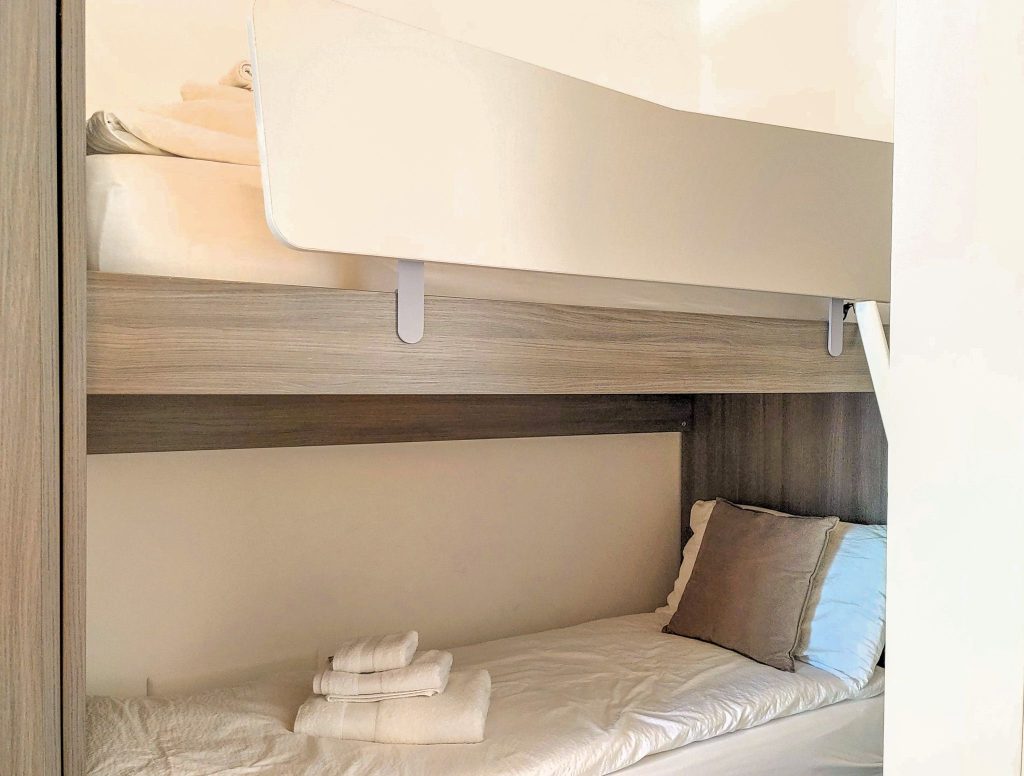 Der Schlafbereich der Wohnung umfasst ein Vierbettzimmer mit einem Doppelbett und einem Stockbett, das zur Poolseite ausgerichtet ist. Das Badezimmer ist mit einer Dusche ausgestattet und rundet das komfortable Wohnambiente ab.