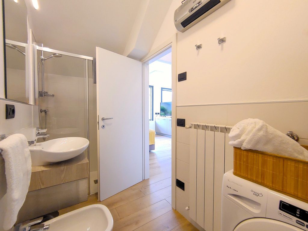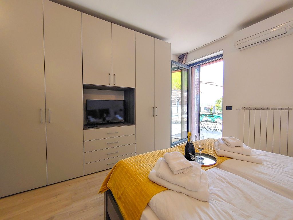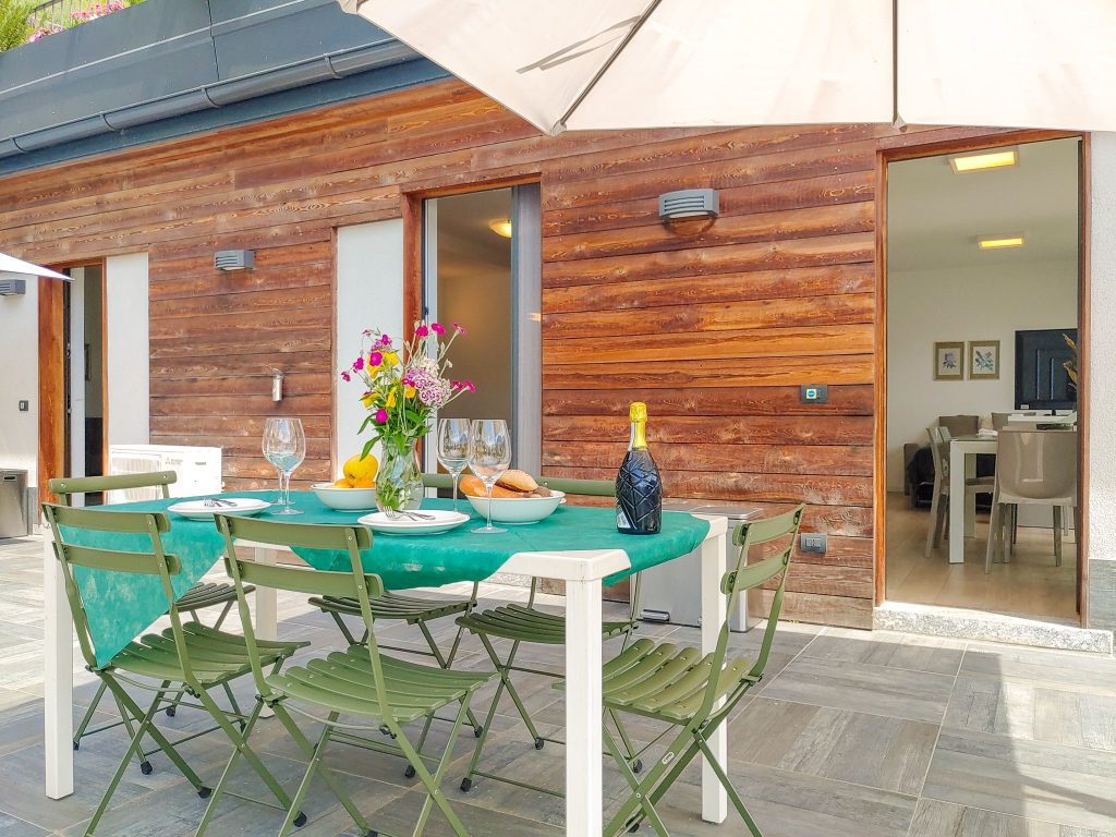 Die Ferienwohnung Emotion besticht durch einen hellen und freundlichen Einrichtungsstil, der hochwertige Möbel mit modernem lombardischen Flair kombiniert. Die Böden sind mit stilvollen Holzdesign-Fliesen ausgestattet.