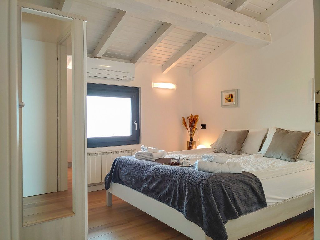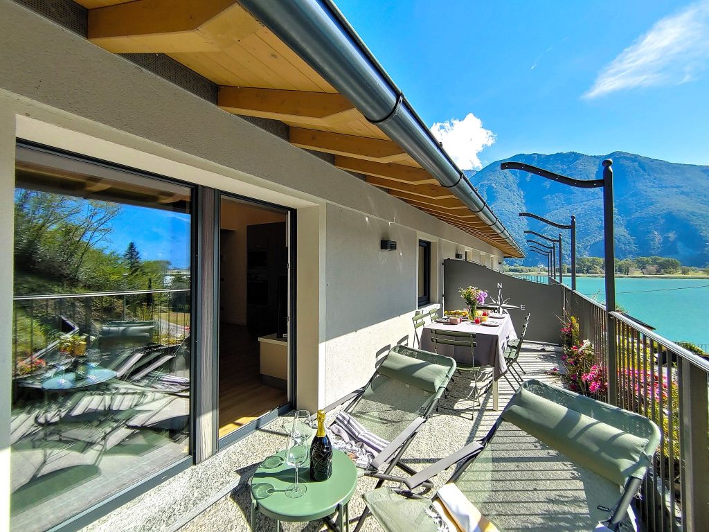 Im Dachgeschoss des Hauses gelegen, schmiegt sich die bergseitige Ferienwohnung charmant an die Felswand an. Über die großzügige Dachterrasse gelangt man über das Treppenhaus links zum Eingang der Wohnung. Der lichtdurchflutete Wohn- und Essbereich umfasst eine seitliche Einbauküche, eine Doppelbettcouch zur See- und Poolseite sowie Zugang zu einem breiten Balkon, der einen atemberaubenden Panoramablick auf den See bietet.