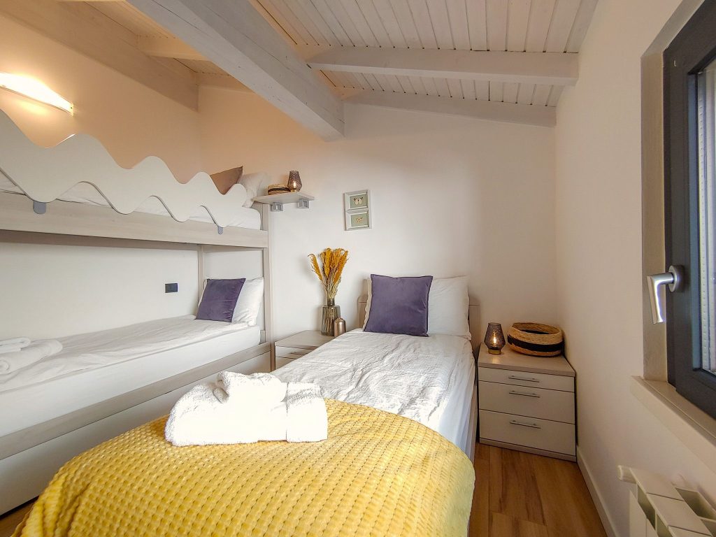 Der Schlafbereich besteht aus einem Doppelbettzimmer und einem Dreibettzimmer mit Einzelbett und Stockbett. Das Badezimmer ist mit einer Dusche ausgestattet und rundet das komfortable Wohnambiente ab.