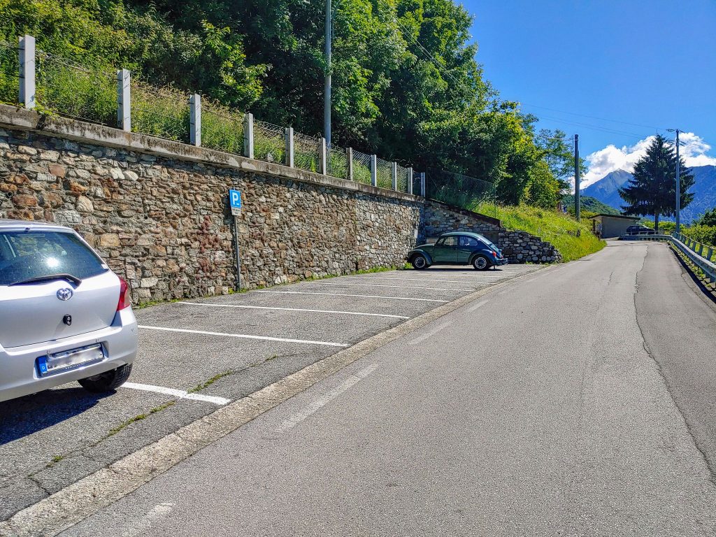 Seitlich gibt es öffentliche Parkmöglichkeiten auf festen Stellplätzen.