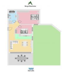 Die Ferienwohnung ist modern und gemütlich eingerichtet. Die große Fensterfassade im Wohnbereich gibt einen faszinierenden Blick auf den See und die großartige Bergkulisse. Der Wohn- und Schlafbereich ist mit lombardischen Fliesenböden.