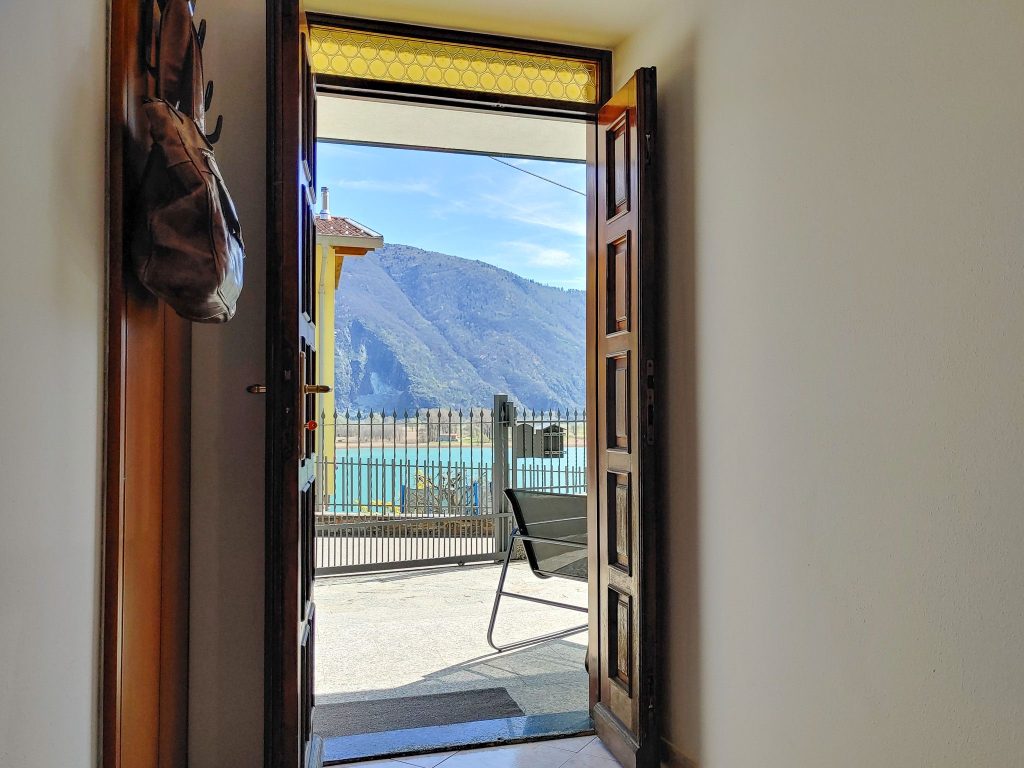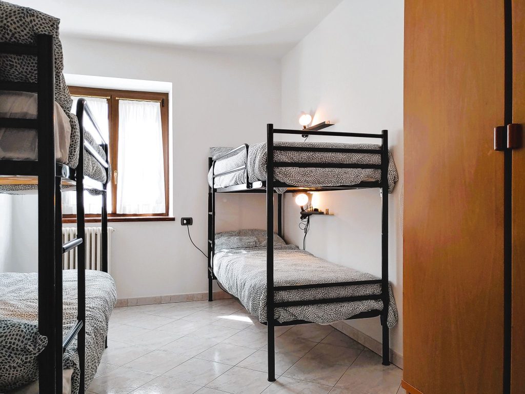 Von der Küche aus führt ein weiterer kleiner Flur zu dem Doppelbettzimmer, Vierbettzimmer und dem Badezimmer. Das Schlafzimmer mit Doppelbett bietet einen malerischen Blick auf den Mezzolasee und die umliegende Berglandschaft. Auf der Bergseite befindet sich das Vierbettzimmer mit zwei Stockbetten.