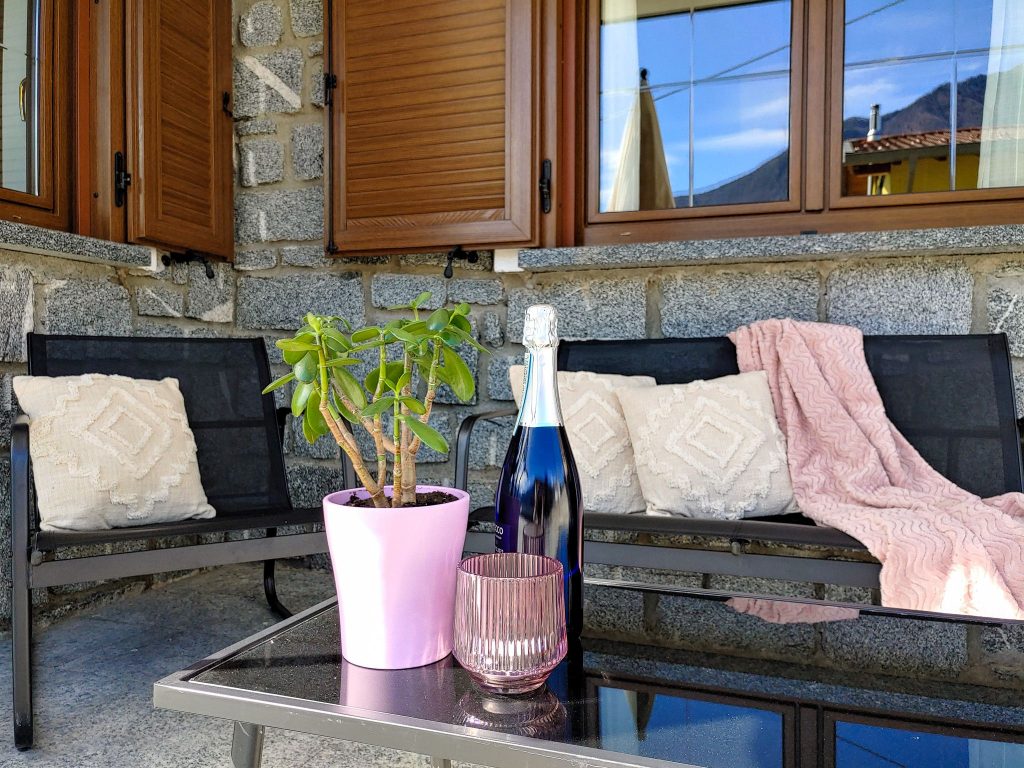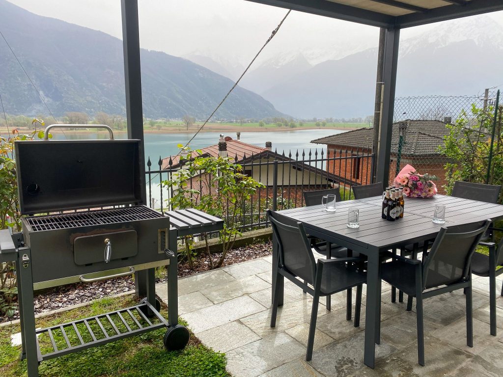 Direkt vor dem Haus am Eingang befindet sich eine einladende teilüberdachte Terrasse mit bequemen Sitzgelegenheiten. Seeseitig erstreckt sich ein gepflegter Garten mit Liegewiese und bequemen Liegestühlen. Eine charmante Pergola mit einem Esstisch und passenden Stühlen komplettiert das Ensemble und darf in Absprache mit dem Vermieter genutzt werden. Von hier haben Sie eine malerische Aussicht auf die Mera und die umliegenden Berge.
