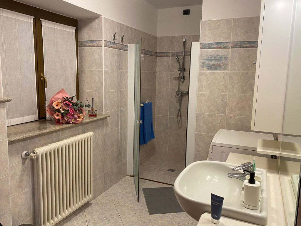 Das Badezimmer ist hell und ist mit Waschbecken, Dusche, WC, Bidet und Waschmaschine.