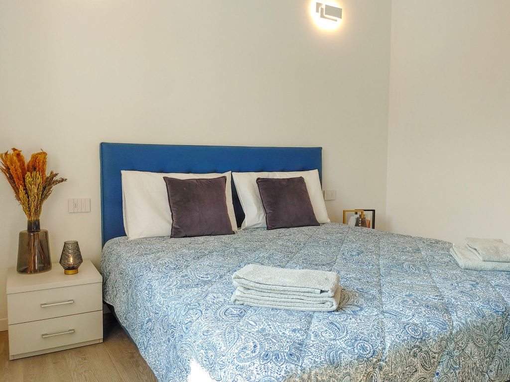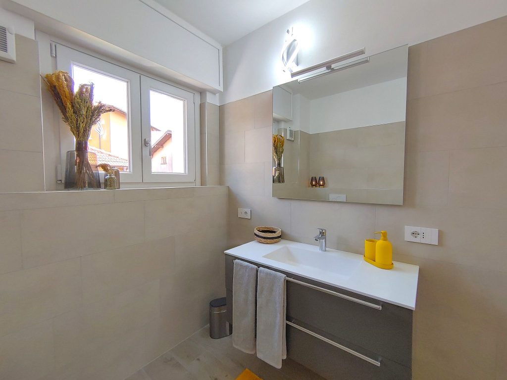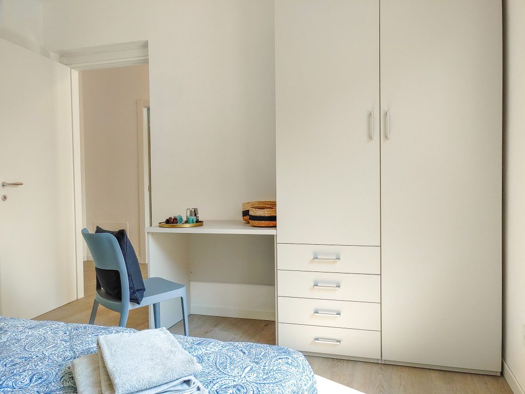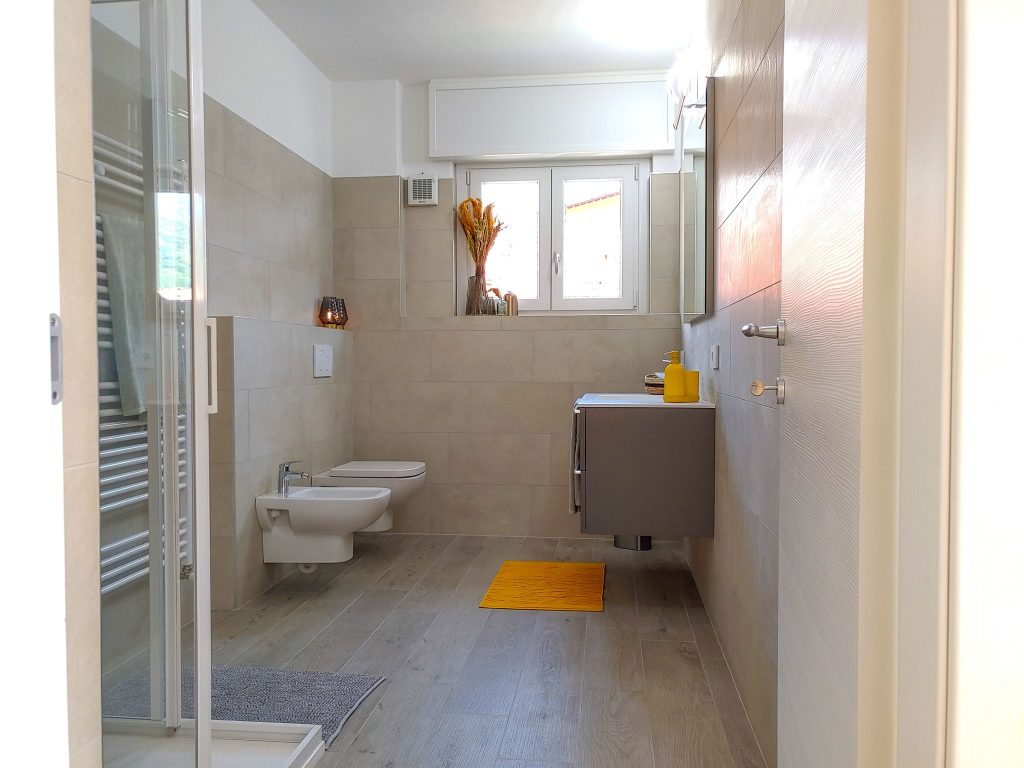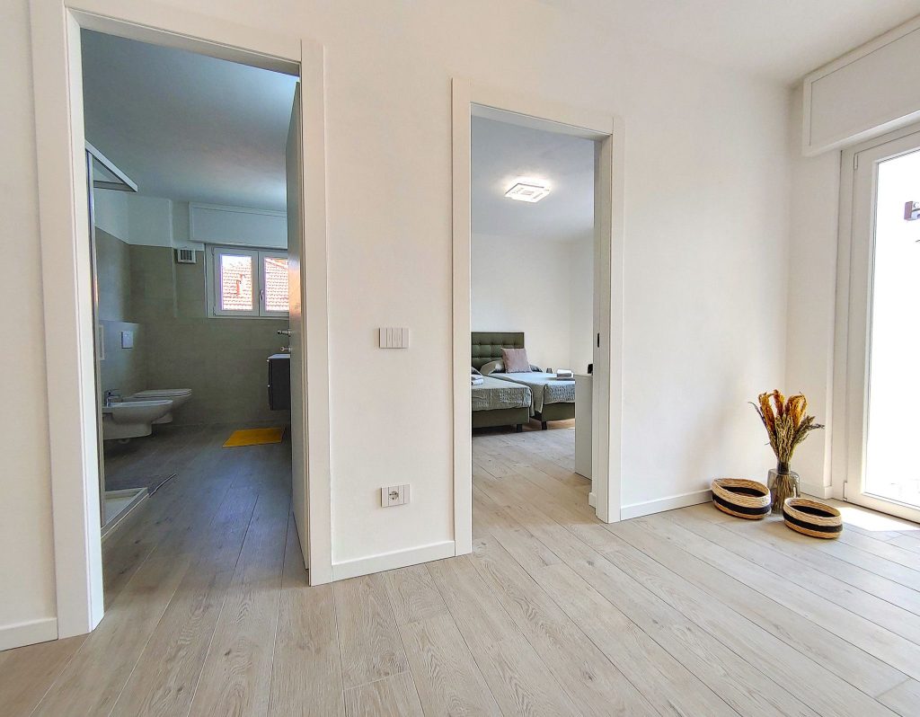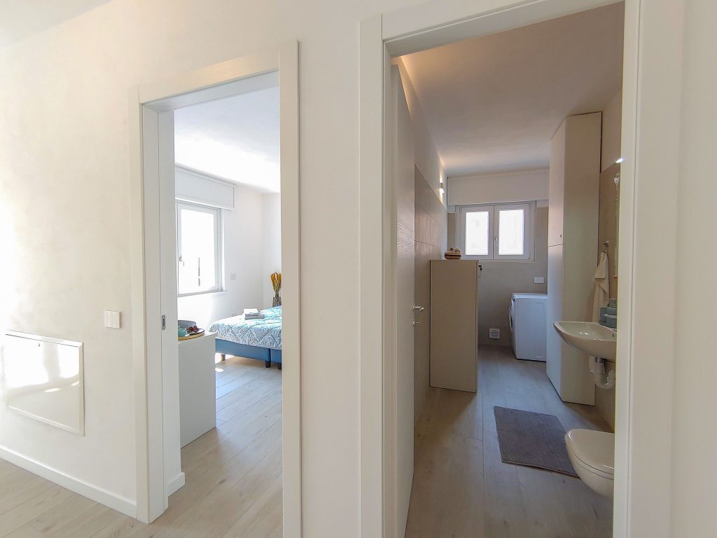 Vom Flur aus erreichen Sie den möblierten Balkon zur Seeseite. Rechts des Flurs liegt das Hauptschlafzimmer mit Doppelbett und Seeblick sowie ein Gäste-Bad mit Waschbecken, WC und Waschmaschine. Auf der linken Seite befindet sich ein Zweibettzimmer sowie ein Bad, ausgestattet mit Waschbecken, Dusche, WC und Bidet.