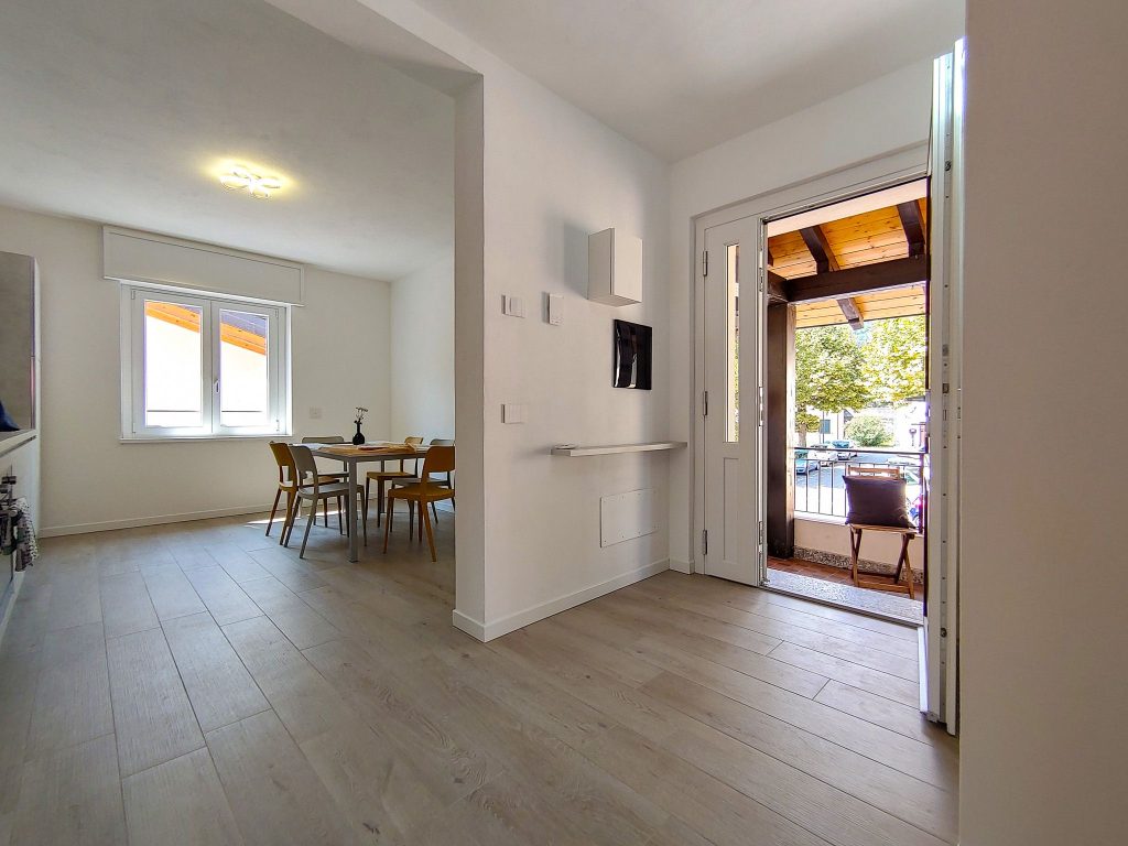 Die Wohnung ist in zwei Bereiche aufgeteilt: Seeseitig befinden sich die Schlafzimmer, während sich bergseitig der Wohn- und Küchenbereich erstreckt. Links vom Eingang gelangen Sie in den hellen Wohnbereich mit einer bequemen Couch und einem TV. Rechts davon befindet sich die moderne Küche mit einer voll ausgestatteten Küchenzeile und einem einladenden Esstisch.