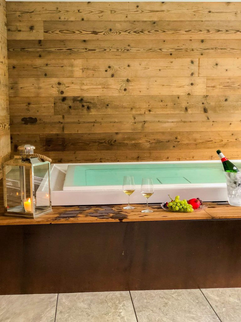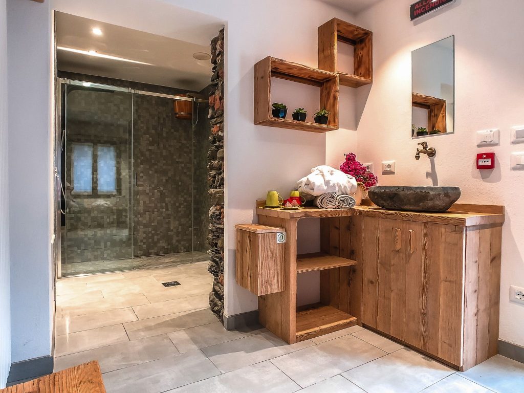 Ein weiteres besonderes Highlight ist der elegante Wellnessbereich, der mit einer Vielzahl von Entspannungsmöglichkeiten ausgestattet ist. Dieser Bereich besticht durch seine geschmackvolle Gestaltung mit natürlichen Elementen wie Steinböden und Holz, die ein authentisches lombardisches Naturflair vermitteln.