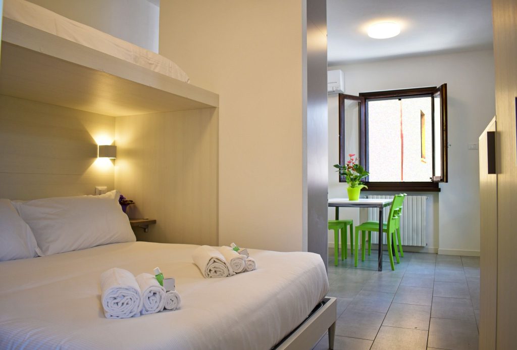 Das Apartment Colico liegt im Obergeschoss und ist mit großer Küche und Wohnzimmer, sowie einem Dreibettzimmer mit Doppelbett und Etagenbett und einem modernen Bad mit Waschtisch, Dusche und WC/Bidet eingerichtet.