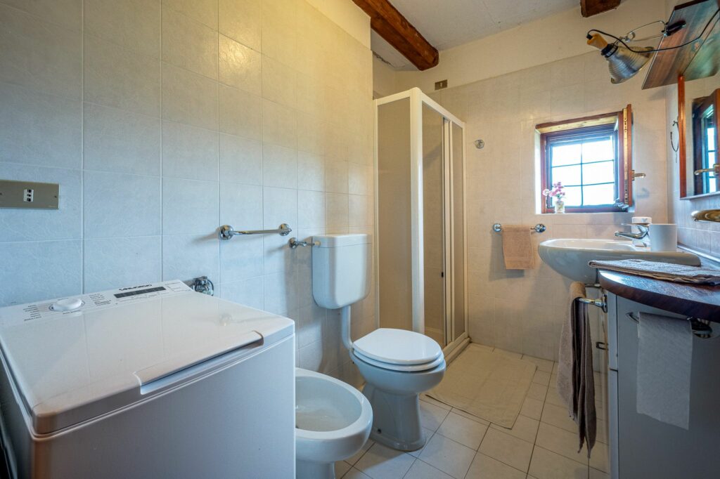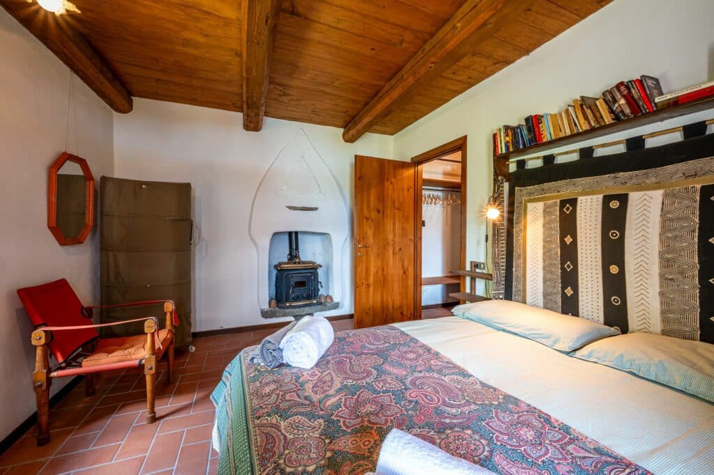 Auf derselben Ebene befindet sich das Schlafzimmer mit einem komfortablen Doppelbett und einem gemütlichen Kaminofen, der an kühleren Abenden für wohlige Wärme bringt. Das Badezimmer ist mit Waschtisch, Dusche, WC, Bidet und Waschmaschine ausgestattet.