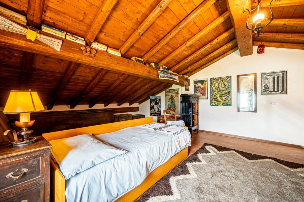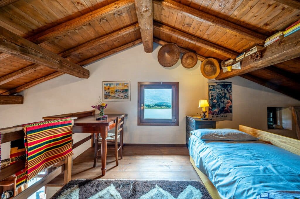 Eine Treppe führt nach oben zur Galerie, wo sich ein weiteres Einzelbett befindet. Dieser Raum eignet sich für zusätzliche Schlafgelegenheiten oder als gemütlicher Rückzugsort.