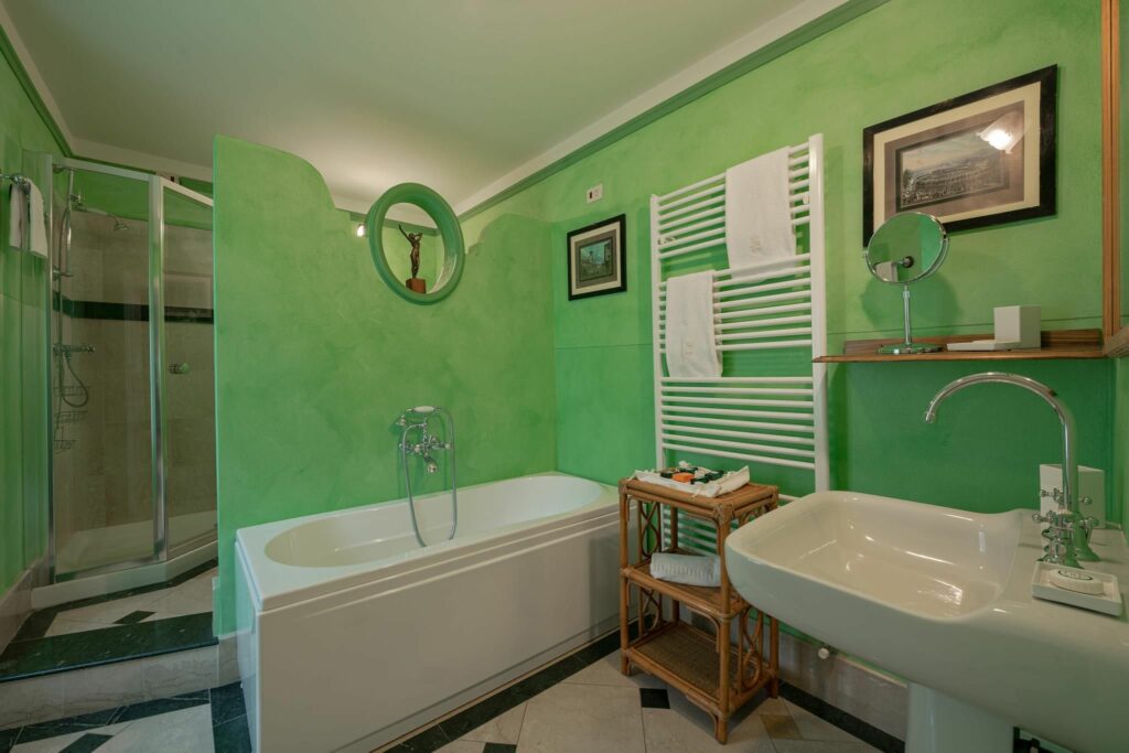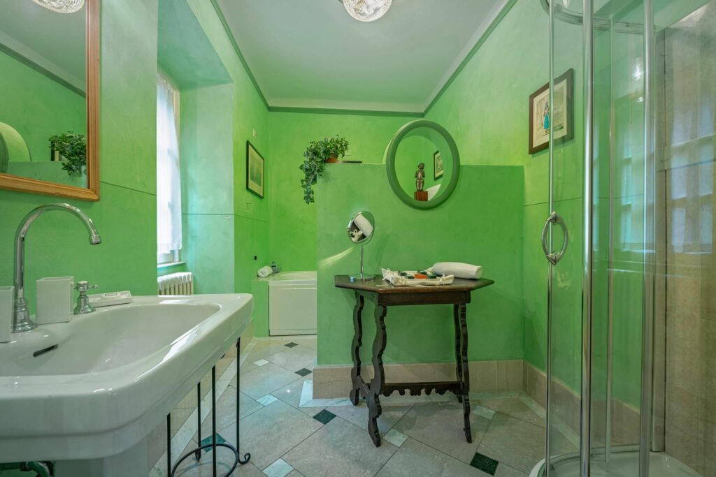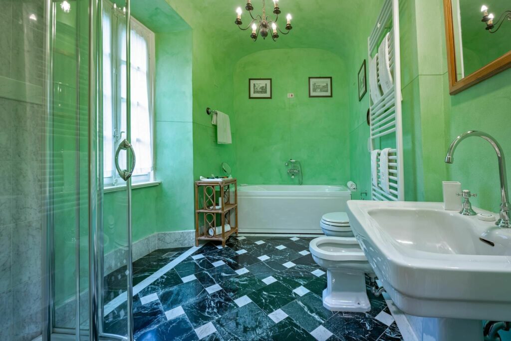- 1 Doppelschlafzimmer (grün) mit Gartenblick; en Suite Badezimmer mit Badewanne und separater Dusche.