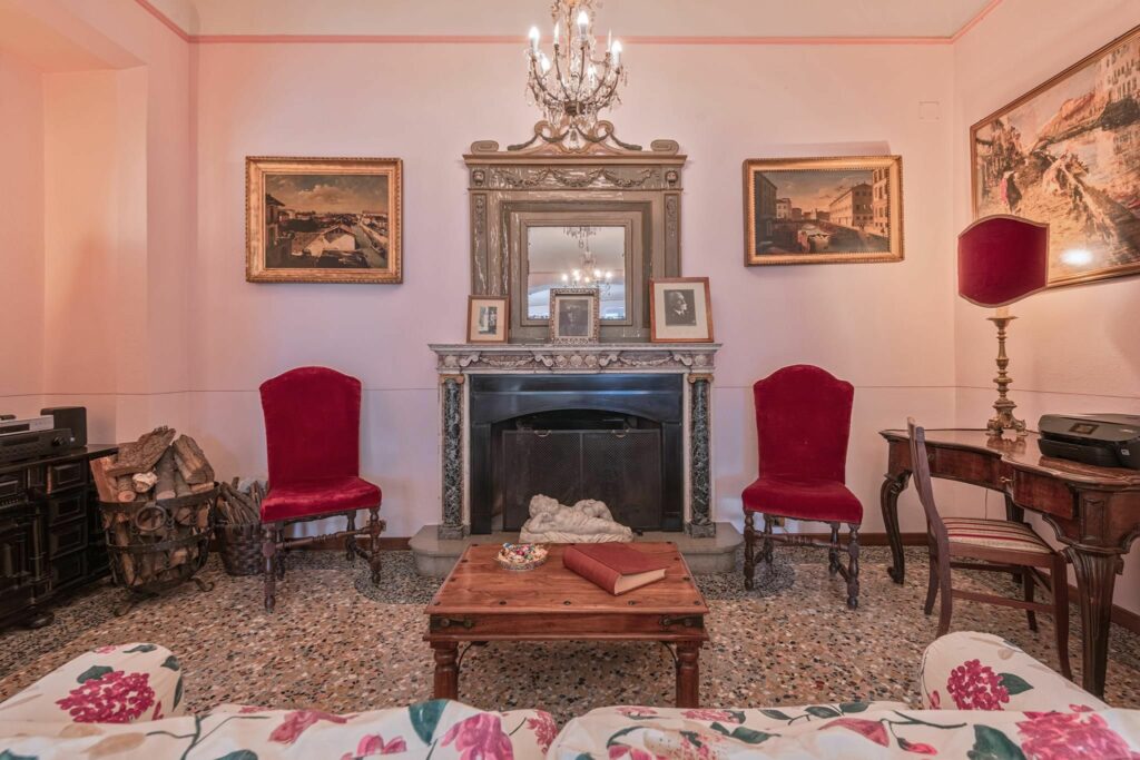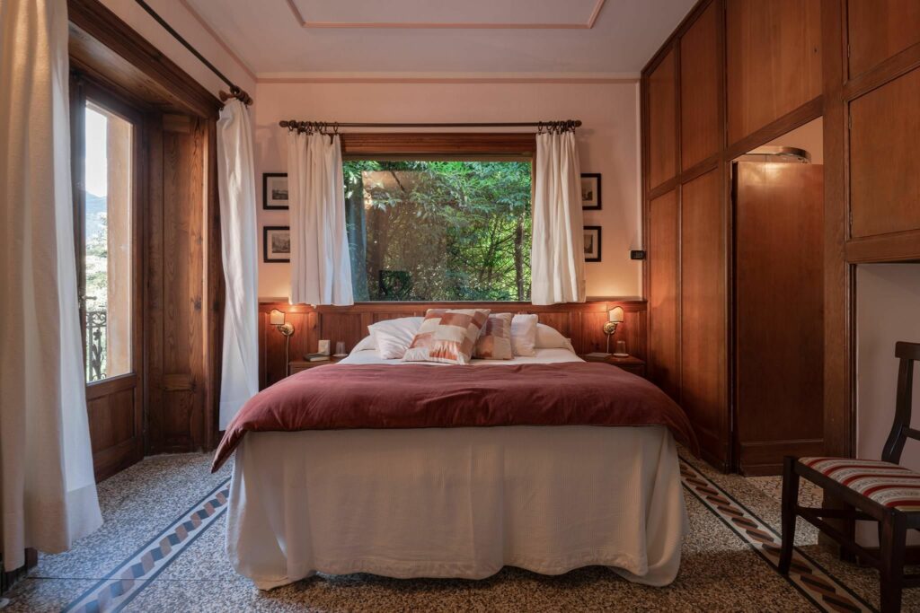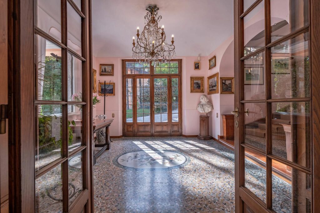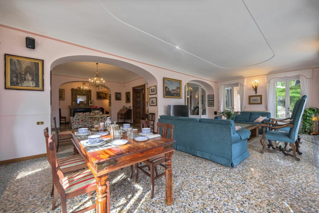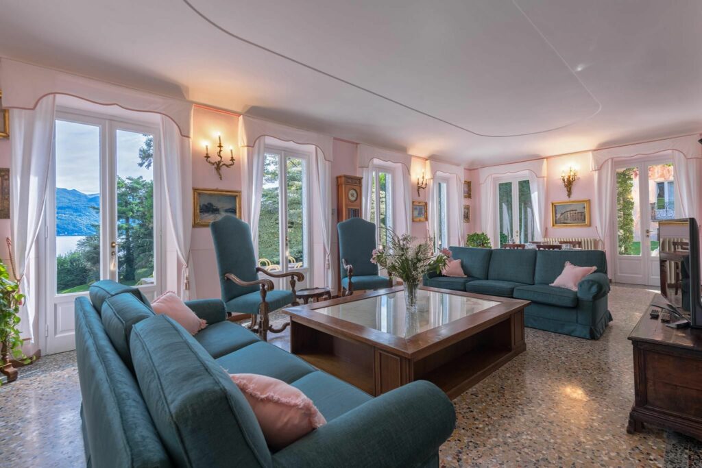 - gemütliches, lichtdurchflutetes Wohnzimmer mit offenem Kamin und Türen, die auf einen großen Rasen mit Blick auf den Comer See führen
