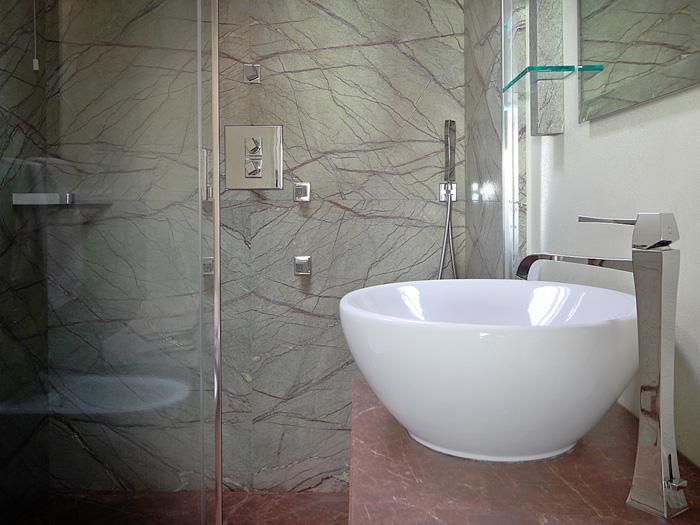 Die luxuriösen Bäder mit hochwertigen, farbharmonischen Marmorböden sind mit Wohlfühl-Regenduschen, zum Teil mit extra Whirlpool und SAT-DV ausgestattet.
